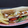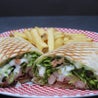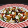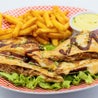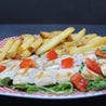 Lattuga, rucola, pomodoro, pomodorini datterino, cotoletta di pollo* panata e fritta, mais, salsa ranch e crostini di pane