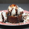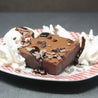 Brownie caldo servito con topping al cioccolato e scaglie di cioccolato