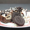 Gustosa torta a base di biscotti oreo® e mousse di cream cheese e cioccolato, servita con topping al cioccolato e scaglie di cioccolato