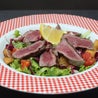 Lattuga, rucola, pomodoro, pomodorini datterino, fettine di manzo cotte alla griglia e crostini di pane*