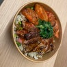 Ciotola di riso condita con bocconcini di tonno, gambero crudo, melanzana in tempura, pesto di basilico, olio extravergine e saleChirashi maguro