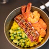Ciotola di riso da sushi con pesce misto e avocadoPoke tamago