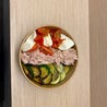 Ciotola di riso da sushi condita con bocconcini di salmone, calamaro, alga nori, salsa spicy e olio extrravergine d’olivaChirashi pesto