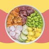 Salmone, tonno rosso, riso, mango, edamame, ravanelli, cetrioli, salsa di soia, semi di sesamo bianco, semi di sesamo nero