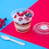Fragole, frutti di bosco freschi, farina d'avena, crema fitness alla vaniglia, coulis artigianale ai frutti di bosco, dolcificante, uova, latte di soia.