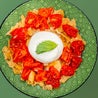 Burrata Autieri, pomodori piccadilly, chips di pane guttiau ed emulsione al basilico. Con crostoni croccanti di pane ai cereali