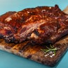 Costine di suino, 700gr, marinate con spezie, affumicate alla brace. Con giardiniera di verdure e salsa agrodolce mediterranea