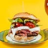 Hamburger di scottona con prosciutto crudo di Parma DOP, fior di latte, pomodoro aromatizzato con timo, insalata verde e maionese ai pomodori secchi