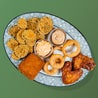 Alette di pollo, mozzarella in carrozza, anelli di cipolla, rondelle di melanzana, con maionese alla birra e maionese ai pomodorini secchi