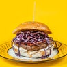 Hamburger di scottona con cremosa robiola di capra, pancetta piacentina DOP croccante, battuto di cipolla rossa di Tropea IGP in agrodolce, insalata verde e maionese