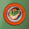 Melanzane grigliate, mozzarella, edamer, salsa di pomodori e pangrattato. Con grana bella Lodi, basilico e crostini di pane aromatizzati