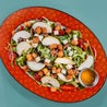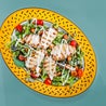 Insalata verde, tagliata di petto di pollo rifinito alla brace, pomodori piccadilly a spicchi e crostini di pane fritti. Servita con salsa di grana bella Lodi