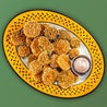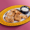 Rondelle dorate di melanzana con panatura al mais. Leggermente speziate, con maionese alla birra