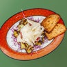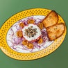 150gr di tartare di manzetta bavarese tagliata al coltello, con zucchine grigliate, sfoglie di raspadura bella Lodi e battuto di cipolla rossa di Tropea IGP in agrodolce. Servita con crostoni croccanti di pane ai cereali e insalata di cavolo cappuccio; con citronette alla menta a parte