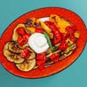 300gr di tagliata di petto di pollo marinato con paprika dolce, pepe nero e zucchero di canna, rifinito alla brace. Accompagnata con zucchine, melanzane e peperoni alla griglia