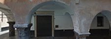 Ristorante esclusivo con soffitto a volta e tavoli in terrazza, che serve aperitivi e pizze.