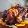 Pollo ruspante allo spiedo, doppio bacon, marmellata di arance amare, burro di arachidi, Worchester