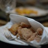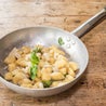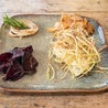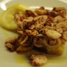 Baccalà in padella su crema di zucchine con chips di rape e porro croccante