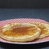 Due classici pancakes serviti caldi, accompagnati da sciroppo d'acero e zucchero a velo
