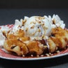 Gelato alla vaniglia, latte, banana fresca, burro di arachidi, topping al cioccolato e ciliegia al maraschino