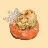 roll con tempura di gambero, maionese e topping di pasta kataifi e salsa avocado, con filetto di salmone in cima