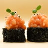 gunkan avvolto da fettine di salmone e tartare di salmone piccante in cima con semi di sesamo