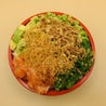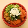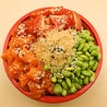Bowl di riso bianco con 4 proteine: 1 porzioni di tartare di salmone, 2 tempura di gambero e 1 tartare di salmone piccante con edamame, avocado, alghe wakame e mandorle