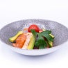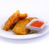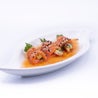 Bocconcini di riso avvolti da zucchina con sopra gambero cotto, mela e maionese