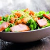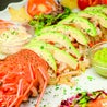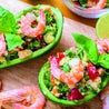Avocado, gamberetti, insalata, pomodorini, formaggio, dadini di prosciutto crudo e basilico