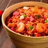 Paella creola preparata con riso, peperoni, pomodori, salsiccia, gamberi, peperoncino, sedano e prezzemolo