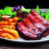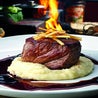 Filetto di manzo in salsa di funghi, accompagnato da un soffice purè, olive nere e patatine fritteSanta Fè ribs