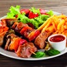 Spiedini di manzo e peperoni accompagnati da insalata, pomodoro, patatine fritte e salsa piccante