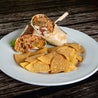 Tre tortillas di grano farcite con pollo, salsa thousand island, mais, insalata, sour cream, pico de gallo, salsa sriracha - piccante - servite con chips di mais