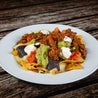 Tortilla di grano farcita con manzo, patatine fritte, crauto rosso, salsa cheddar, purea di fagioli, sour cream e pico de gallo servito con chips di mais