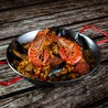 Paella messicana con riso, gamberoni, cozze, pollo, filetto di maiale, salame piccante e peperoni