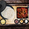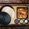 Filetto di maiale marinato, grigliato e tagliato a striscioline e gamberetti sgusciati marinati, grigliati con champignons e salsa bbq, serviti su piastra rovente, con contorno di sour cream, salsa avocado