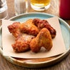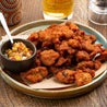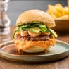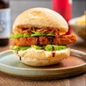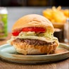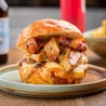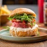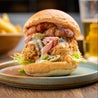 Pane artigianale al latte, cosce di pollo marinate e fritte, insalata iceberg, salsa ricca (con peperoni verdi, pomodori, prezzemolo, yogurt e lime), anelli di cipolla avvolti nel bacon e fritti.
