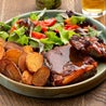 Pane senza glutine, carpaccio di manzo al bbq in affumicatura di ciliegio, cipolle rosse all’aceto di birra affumicata di nostra produzione, salsa Mystic ranch