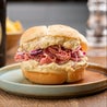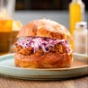 Pane senza glutine, spalla di maiale sfilacciata condita con la nostra salsa barbecue, mystic salad leggermente piccante