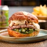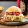 Pane hamburger artigianale alle cipolle, hamburger di culatello marinato in salsa bbq con peperoni verdi, la nostra capricciosa, coppa affumicata, mozzarella di bufala affumicata