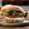 Pane artigianale al crunchy mais, burger vegetariano di verdure e avena, crema di melanzane alla brace, scalogno in oliocottura, maionese vegana alla mediterranea, rucola, succo di limone