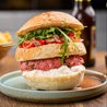 Pane artigianale classico, burger di maiale nero della Lomellina, gamberi alla piastra, cetrioli conditi al sesamo nero, panna acida con salsa sambal leggermente piccante, insalata iceberg