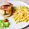 Hamburger, formaggio dolce, cipolle rosse caramellate, bacon, salsa, pane
