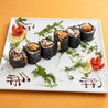 Pomodoro a cubetti, pesto di pistacchi, pesce spada affumicata, cozze, gamberetti e rucolaSushi di pizza