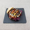 Cotoletta vegetariana, salsa bbq al miele fr, burro d’arachidi fr, glassa di aceto balsamico, pomodoro, peperoni, radicchio, pecorino