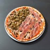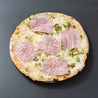 Fiordilatte dell'Agro Pontino, pomodoro San Marzano dell'Agro Sarnese Nocerino DOP, funghi champignon freschi Azienda Agricola "Flli Milletti", olive leccine a crudo Azienda "De Carlo" carciofi spadellati dalla nostra cucina e prosciutto crudo di Norcia stagionato 20 mesi