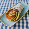 Pita con polpettine di ceci, salsa melitzanosalata, pomodoro, cipolla, cetrioli, peperoni e patatine