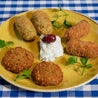 Polpettine di zucchine, polpettine di ceci, crocchette di melazane, pita, tzaziki, insalata greca, feta tiganiti e mousakasAntipasti