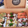 2 mini smorrebrod al salmone marinato, mini smorrebrod con barbabietola e insalata di patate, mini smorrebrod all’aringa fermentata, mini smorrebrod al västerbotten, mini smorrebrod con tartare di manzo, mini smorrebrod al cipollotto, aringhe marinate 150gr, salmone marinato all’aneto 150gr, vino bianco 75cl