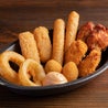 2 onion rings*, 2 chicken nuggets*, 2 chicken wings*, 2 mozzarella sticks*, 2 green balls*, 2 cheesy sticks*, serviti con salsa Old Wild West.
